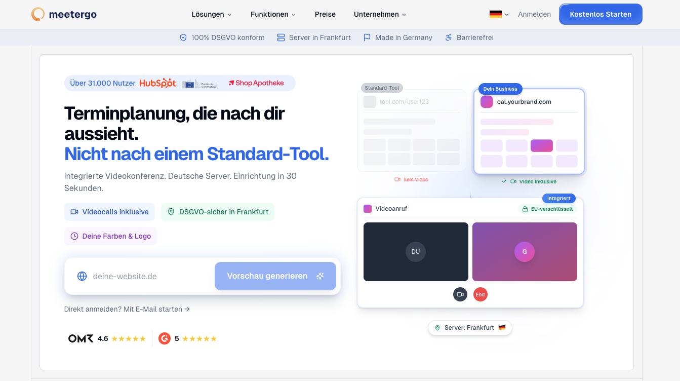Um Termine mit Kunden so einfach und schnell wie möglich zu koordinieren, nutze ich das Terminplanungs-Tool meetergo. Da mir Datenschutz sehr wichtig ist, habe ich mich bewusst für diese DSGVO-konforme Alternative aus Deutschland entschieden. Alle Daten werden auf deutschen Servern gespeichert, was mir und meinen Kunden die Sicherheit gibt, dass ihre Informationen nach höchsten europäischen Datenschutzstandards behandelt werden. Ich kann meetergo daher uneingeschränkt empfehlen. Mit diesem Link* erhältst du 50% Rabatt auf die ersten 3 Monate.